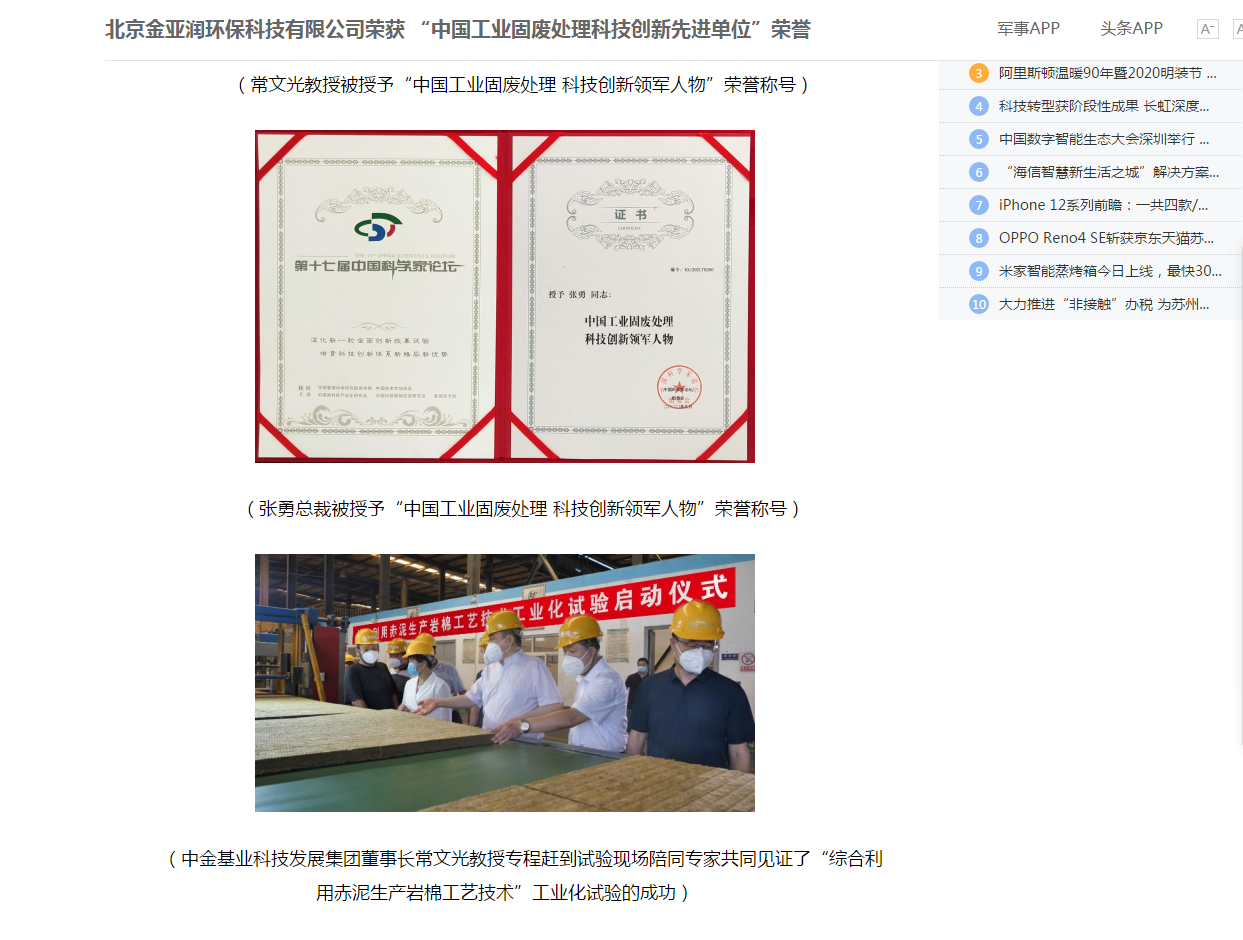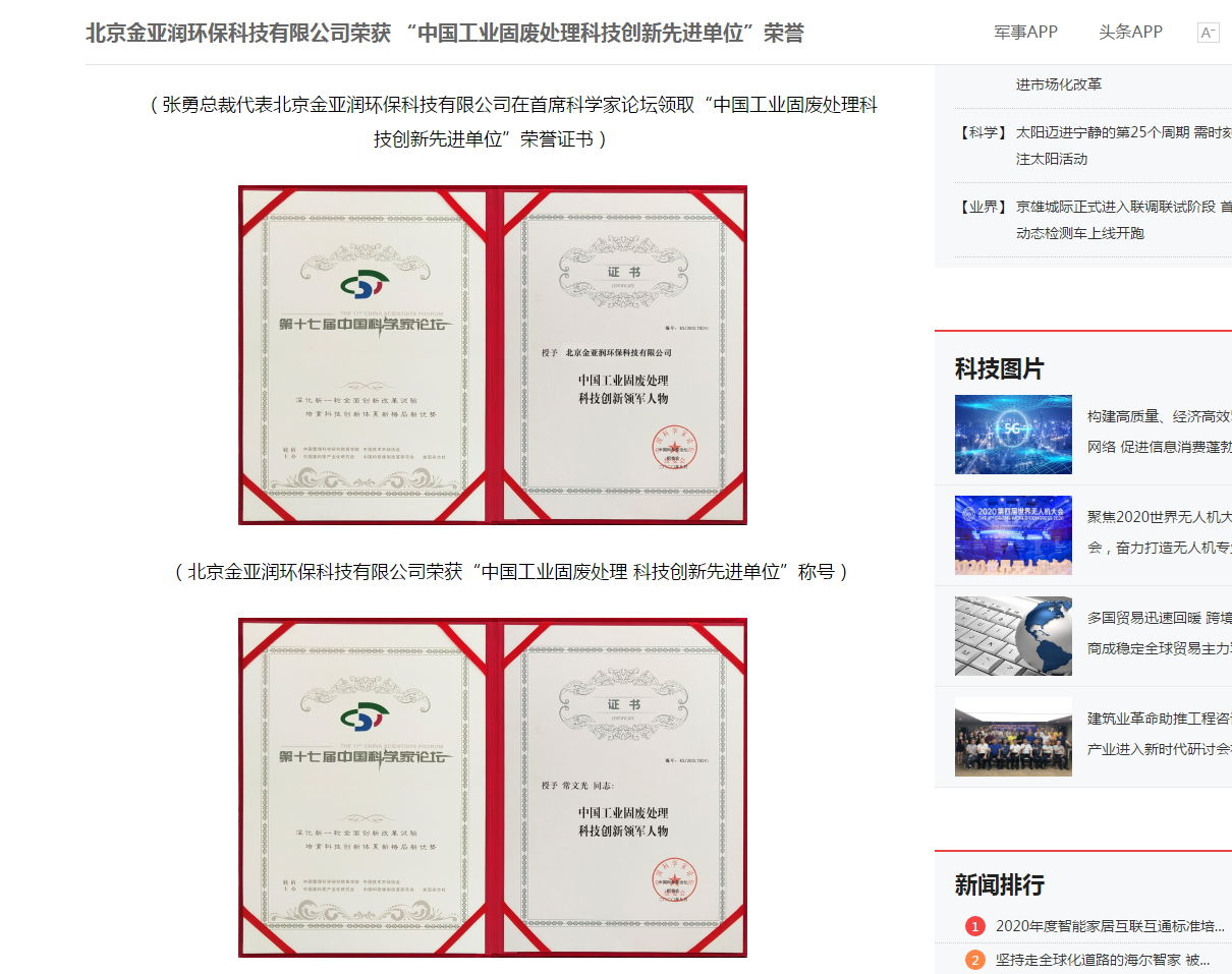 中華網 刊載 北京金亞潤榮獲 “中國工業(yè)固廢處理科技創(chuàng)新先進單位”榮譽稱號